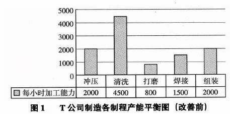 1)制造過程中由于各功能制造單位、制程產(chǎn)能不平衡,不可避免地造成加工能力低的制程前在制品(WIP)堆積,同時(shí)給后工站的作業(yè)帶來了極大的不便。圖1是T公司制造的一個(gè)產(chǎn)能平衡圖,T公司制造有沖壓、清洗、打磨、焊接、組裝共五個(gè)制程,有一個(gè)產(chǎn)品要順次經(jīng)過這五個(gè)制程,那么這個(gè)產(chǎn)能如何計(jì)算呢?要看瓶頸制程的加工能力。