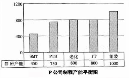(4)其他。當(dāng)設(shè)備比較昂貴時(shí),管理及財(cái)務(wù)人員有傾向提高稼動(dòng)率,生產(chǎn)過多的產(chǎn)品。下圖是P公司的一個(gè)案例,其內(nèi)部各制程分別是SMT-PTH-老化-FT-組裝,其產(chǎn)能分布如下: