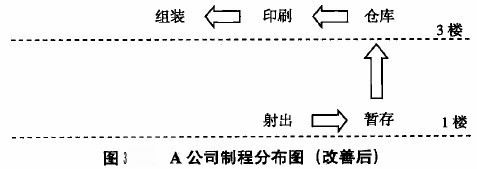 本制程為:1樓的射出完成后,由于后面的印刷效率遠(yuǎn)遠(yuǎn)大于輸出,所以射出后產(chǎn)品只能先入庫,經(jīng)過印刷后,要先在1樓暫存,等當(dāng)班結(jié)束時(shí)再入3樓的倉庫,后一個(gè)制程-組裝需要時(shí)來3樓的倉庫領(lǐng)取。這個(gè)流程中有入存2次,WIP I次,勢(shì)必造成制造過早的浪費(fèi)。
