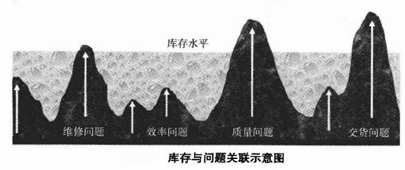 在上圖中,水面代表庫存水平,礁石代表問題點(diǎn),當(dāng)水面高時(shí)礁石在水底,也就是說庫存高時(shí),問題都被掩蓋。只有當(dāng)水面低時(shí),礁石才會(huì)露出水面,也就是問題點(diǎn)才暴露,這就是庫存對(duì)于暴露問題的重要意義。