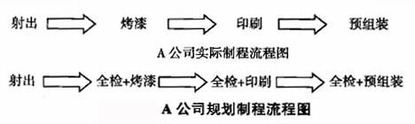2)由于規(guī)劃不經(jīng)濟(jì)不理想,造成制程路程不流線化,無法實(shí)現(xiàn)產(chǎn)品流動(dòng),而存在遷回、曲折、往復(fù)、停滯現(xiàn)象,使得生產(chǎn)不得已提前或有WIP,這也是造成制造過多過早的重要原因。如圖2所示,A公司制程有射出、印刷、組裝等,其制程分布如下: