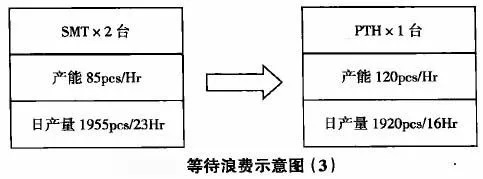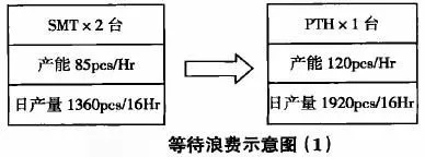 PTH日產(chǎn)量1920pce/16Hr,SMT日產(chǎn)量1360pce/16Hr,這樣安排的話,PTH制程上班的16個(gè)小時(shí)中有4.6個(gè)小時(shí)人和機(jī)處于等待狀態(tài)。