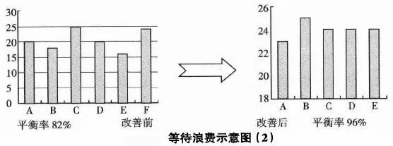 改善前有A-F共6個(gè)工站(制程),生產(chǎn)線不平衡,平衡率只有82%,等待較多。而改善后減少了一個(gè)工站,只有A一E共5個(gè)工站(制程),同時(shí)平衡率96%,減少了很多等待。