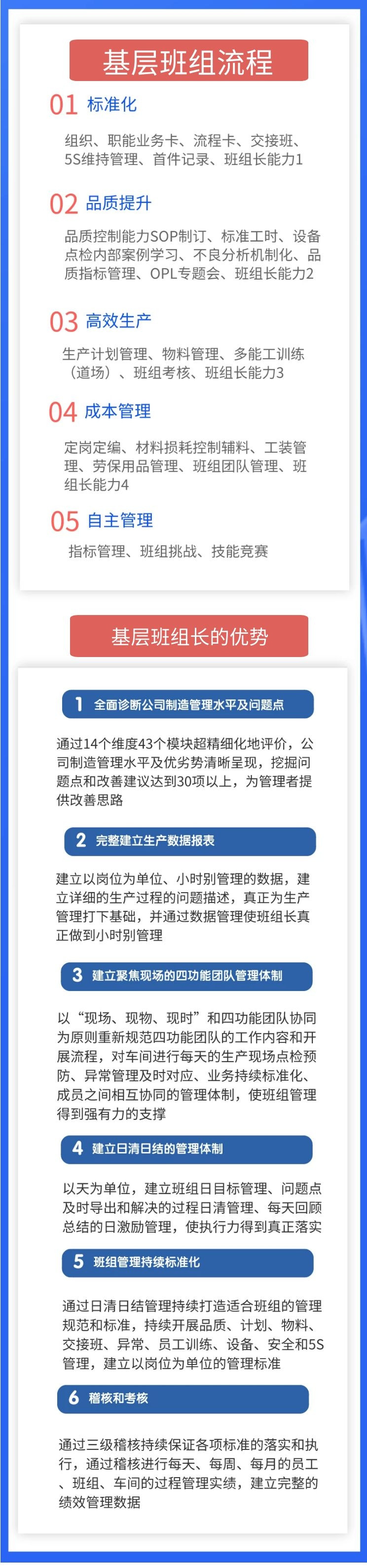 遠大咨詢集團根據(jù)100多家企業(yè)服務(wù)經(jīng)驗開發(fā)基層班組管理咨詢產(chǎn)品。以推進班組管理各方面業(yè)務(wù)的標準化開始,從班組管理規(guī)范化開始,逐步推進班組的品質(zhì)管理能力,效率管理能力,成本管理能力,逐步達到班組自主管理的程度。