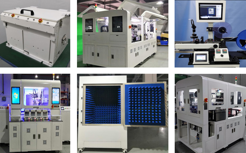 公司產品分為屏蔽箱系列和自動化系列兩個模塊,包括2.4G/5.8G、5G毫米波等廠測與實驗室測試用各類RF/AF手/自動、屏蔽隔音箱和混響室;及以無線產品自動測試為主的四軸無線模塊自動測試機、直線運動模組型自動測試機、智能視覺編帶機、PCBA自動貼標機、鼠標自動測試ATE、無線IC模塊自動燒錄測試一體機、CCD視覺自動篩選分揀機等。