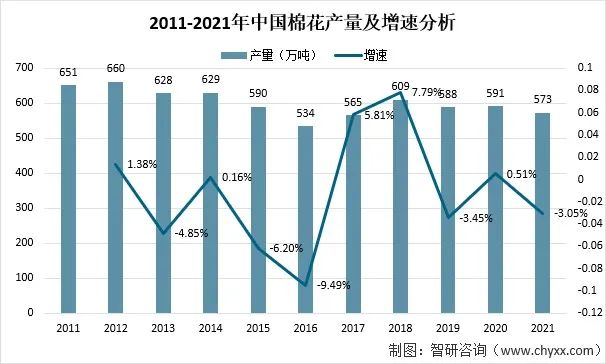 2021年,受種植效益和種植結(jié)構(gòu)調(diào)整等因素影響,種植面積降幅較大,帶動中國整體棉花種植面積及產(chǎn)量下降。全國棉花總產(chǎn)量573萬噸,比2020年減少18萬噸,下降3.05%。