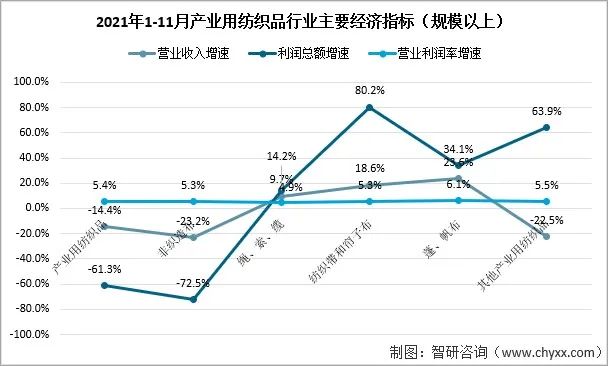 2021年1-11月產(chǎn)業(yè)用紡織品行業(yè)規(guī)模以上企業(yè)的營業(yè)收入同比下降14.4%,利潤總額同比下降61.3%,營業(yè)利潤率為5.4%。非織造布行業(yè)的營業(yè)收入和利潤總額分別同比下降23.2%和72.5%,營業(yè)利潤率為5.3%。繩、索、纜行業(yè)的營業(yè)收入和利潤總額分別同比增長9.7%和14.2%,營業(yè)利潤率為4.9%。紡織帶和簾子布市場延續(xù)了良好的發(fā)展勢頭,營業(yè)收入和利潤總額分別同比增長18.6%和80.2%,營業(yè)利潤率達到5.3%。篷、帆布的營業(yè)收入和利潤總額分別同比增長23.6%和34.1%,6.1%的營業(yè)利潤率為行業(yè)最高。醫(yī)療衛(wèi)生、過濾、土工用紡織品所在的其他產(chǎn)業(yè)用紡織品的營業(yè)收入和利潤總額分別同比下降22.5%和63.9%,營業(yè)利潤率為5.5%。
