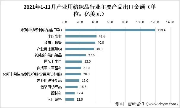 根據(jù)中國海關(guān)數(shù)據(jù),2021年1-11月我國產(chǎn)業(yè)用紡織品主要出口產(chǎn)品(按出口金額排名前十二類產(chǎn)品)的出口額為391.1億美元,同比下降53.0%。分產(chǎn)品來看,未列名紡織制成品(主要為口罩)目前是行業(yè)最大的出口產(chǎn)品,出口金額為119.4億美元,但因國外對口罩需求的大幅回落其出口額較上年同期下降了77.0%;氈布/帳篷、產(chǎn)業(yè)用涂層織物等傳統(tǒng)產(chǎn)品的出口額分別為40.0億美元和38.0億美元,同比增長52.7%和33.6%;合成革及革基布的出口額為21.0億美元,同比增長44.7%。非織造布及相關(guān)制品的出口呈現(xiàn)不同走勢,卷材出口41.6億美元,同比下降9.0%,出口量126.0萬噸,同比小幅上漲0.8%,出口均價同比下滑9.8%;化纖非織造布制防護服(含醫(yī)用防護服)出口20.9億美元,同比下降80.2%;一次性衛(wèi)生用品出口22.5億美元,同比增長10.5%。