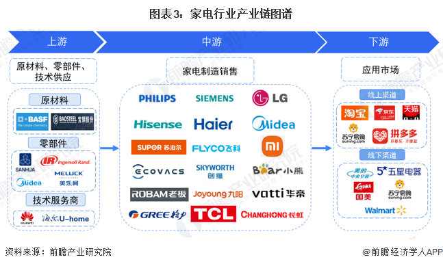 小家電產(chǎn)業(yè)鏈主要分為上游原材料和零部件供應(yīng)、中游小家電制造和下游小家電銷(xiāo)售三大環(huán)節(jié)。小家電行業(yè)上游原材料和零部件包括電加熱器、電器閥件、塑料、金屬材料、包裝材料等各類(lèi)零部件供應(yīng)商,由于各種不同小家電所需原材料零部件不同,因此上游覆蓋企業(yè)范圍較廣,品牌也較多元化;中游小家電制造企業(yè)包含了國(guó)外大企業(yè)(如飛利浦)和國(guó)內(nèi)家電綜合制造企業(yè)(如美的)、小家電制造企業(yè)各類(lèi)型企業(yè);下游主流銷(xiāo)售渠道有綜合電商平臺(tái)(如天貓商城、京東商城等)、線下家電賣(mài)場(chǎng)(如蘇寧、國(guó)美)、大型商超、各級(jí)經(jīng)銷(xiāo)商門(mén)店、公司直營(yíng)門(mén)店等各類(lèi)分銷(xiāo)渠道。