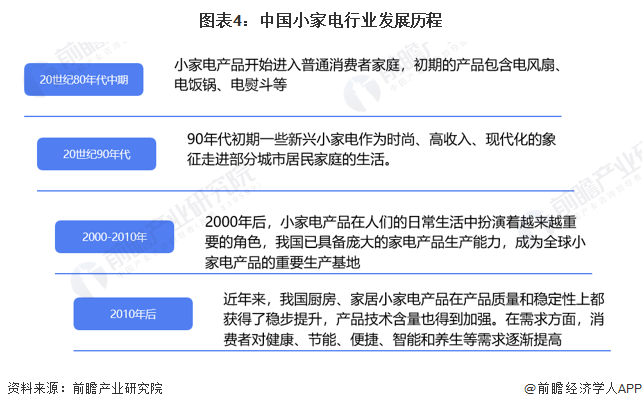 中國(guó)小家電行業(yè)發(fā)展歷程可以分為四個(gè)階段,20世紀(jì)80年代中期小家電產(chǎn)品開(kāi)始進(jìn)入普通消費(fèi)者家庭,初期的產(chǎn)品包含電風(fēng)扇、電飯鍋、電熨斗等;20世紀(jì)90年代新興小家電作為時(shí)尚的象征開(kāi)始走入城市居民生活;2000年后,小家電產(chǎn)品在人們的日常生活中扮演著越來(lái)越重要的角色,中國(guó)也開(kāi)始成為小家電重要的生產(chǎn)基地;2010年后,產(chǎn)品質(zhì)量和穩(wěn)定性穩(wěn)步提高,健康、節(jié)能、便捷、智能和養(yǎng)生等需求也刺激行業(yè)進(jìn)一步發(fā)展。目前行業(yè)進(jìn)入多品類(lèi)、高質(zhì)量、智能化的全新階段。
