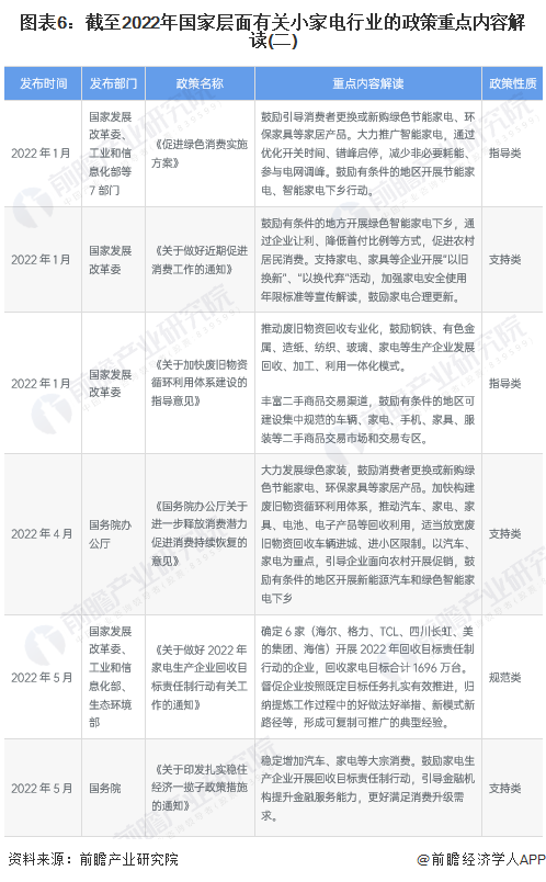2022年1月,國(guó)家發(fā)改委擬定《關(guān)于做好近期促進(jìn)消費(fèi)工作的通知》,鼓勵(lì)有條件的地方開(kāi)展綠色智能家電下鄉(xiāng),通過(guò)企業(yè)讓利、降低首付比例等方式,促進(jìn)農(nóng)村居民消費(fèi)。支持家電、家具等企業(yè)開(kāi)展“以舊換新”、“以換代棄”活動(dòng),加強(qiáng)家電安全使用年限標(biāo)準(zhǔn)等宣傳解讀,鼓勵(lì)家電合理更新。2022年一季度,中國(guó)境內(nèi)零星爆發(fā)新型冠狀肺炎疫情導(dǎo)致經(jīng)濟(jì)增長(zhǎng)受阻,國(guó)務(wù)院也于2022年5月制定了一攬子穩(wěn)住經(jīng)濟(jì)的政策措施,其中提及穩(wěn)定家電產(chǎn)品的消費(fèi)??偨Y(jié)梳理來(lái)看,近年來(lái)國(guó)家層面對(duì)于小家電行業(yè)的政策關(guān)鍵詞在于:新一輪家電下鄉(xiāng)、以舊換新、補(bǔ)貼消費(fèi)、家電回收。