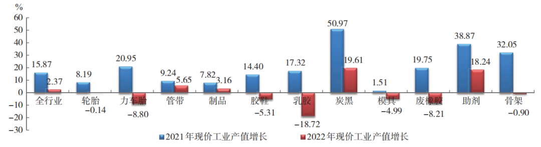 2022年,橡膠行業(yè)現(xiàn)價工業(yè)總產值增長2.37%,增幅減少13.50個百分點。