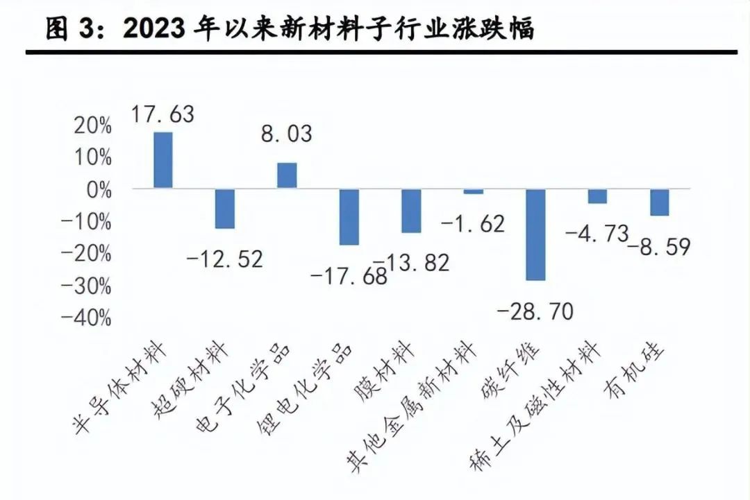 根據(jù)工信部《新材料產(chǎn)業(yè)發(fā)展指南》,新材料主要包括先進(jìn)基礎(chǔ)材料、關(guān)鍵戰(zhàn)略材料、前沿新材料三大類。由于尚未有較為統(tǒng)一和明確的新材料子行業(yè)劃分標(biāo)準(zhǔn)。因此,我們根據(jù)《新材 料產(chǎn)業(yè)發(fā)展指南》,選取有機(jī)硅等行業(yè)代表先進(jìn)基礎(chǔ)材料板塊,選取半導(dǎo)體材料、 超硬材料、電子化學(xué)品、鋰電化學(xué)品、膜材料、碳纖維、稀土及磁性材料等行業(yè)代表關(guān)鍵戰(zhàn)略材料;選取公司主營業(yè)務(wù)以金屬增材制造材料為主的其他金屬新材料行業(yè)代表前沿新材料,共同組成新材料子板塊。